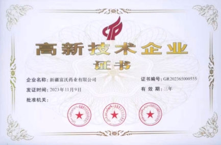 新疆富沃药业有限公司坚持以“以科技为依托、以市场为导向、坚持自主创新原则,以质量第一、合规生产” 的经营理念,以诚为本,赢得社会各界人士的信赖。公司质量纯正、质优价廉的产品深受国内外客商的喜爱和赞誉。富沃药业有限公司愿与国内外药界同仁志士增进合作,携手共谋发展和繁荣。